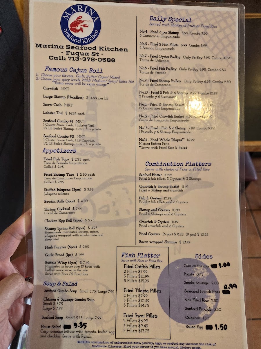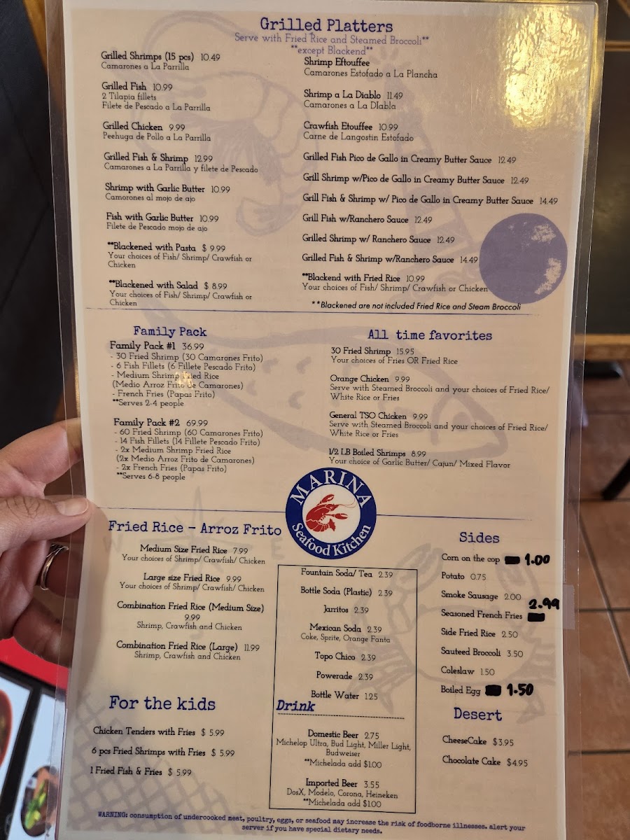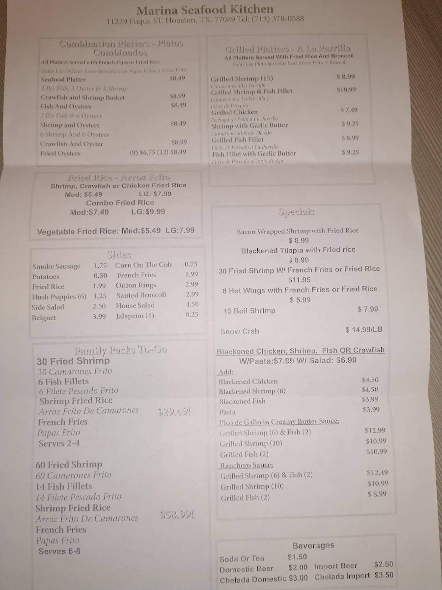 Introducing the menu at Marina Seafood Kitchen - Fuqua, located in the heart of Houston, Texas, offers a delightful escape for seafood lovers. This hidden gem showcases an array of dishes that celebrate the ocean’s bounty, from the juiciest crawfish to flavorful shrimp boils. Customers rave about the affordable family packs, ensuring satisfaction without breaking the bank.